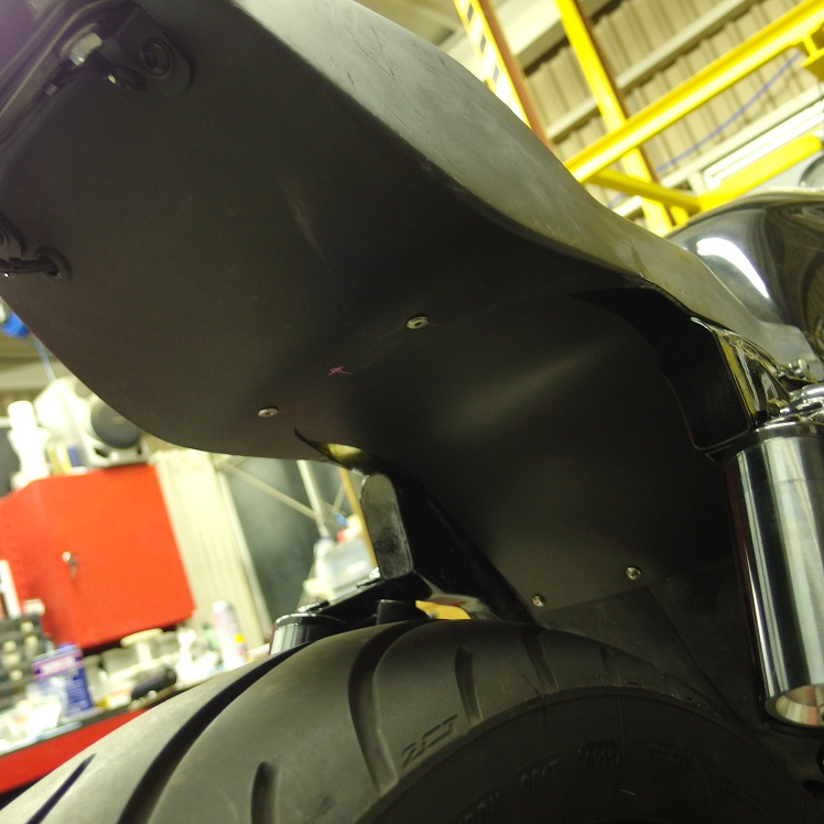 シートカウルを車体に付けると裏はこんな感じで大口を開けており、いつでも泥水受け入れOK状態と、あまり好ましくないので・・・・