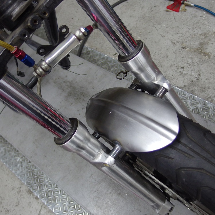 一般的では前後にアクスルが移動するので、スイングアームにマッドガードが付けられるんですけどね。エキセントリックの場合はそうはいかず、考えた結果アクスルと一緒にマッドガードが円を描くように動くのが一番いいのかなと。