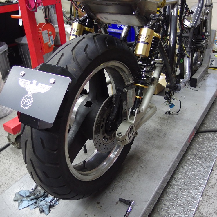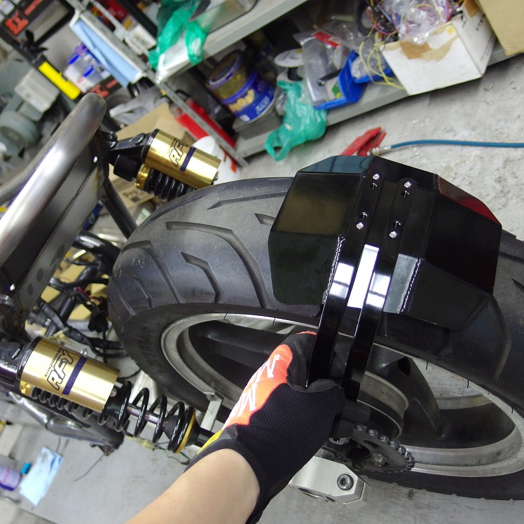 タイヤに被せているのは、ハーレー用の汎用リヤフェンダーで、中心にリブが付いているものになります!