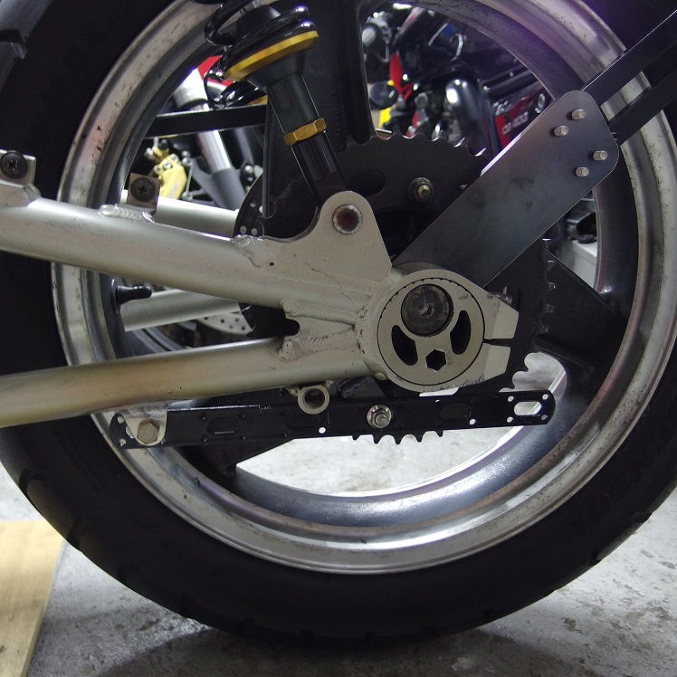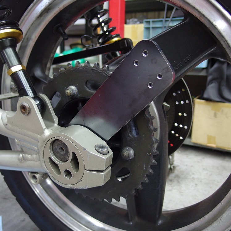 ホイール脱着の度に広告バックプレートを外す必要がありますので、少しでも手間を軽減するのと、面圧にする事により、チェーンガードへの負担を軽減する目的があります!!