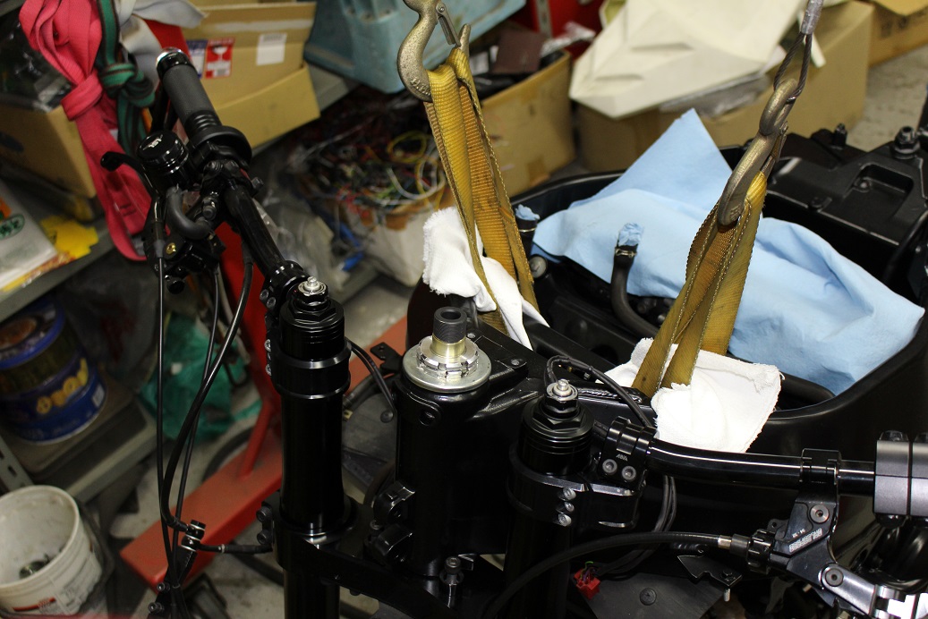 ステムを締め付けたらトップブリッジの取り付け。