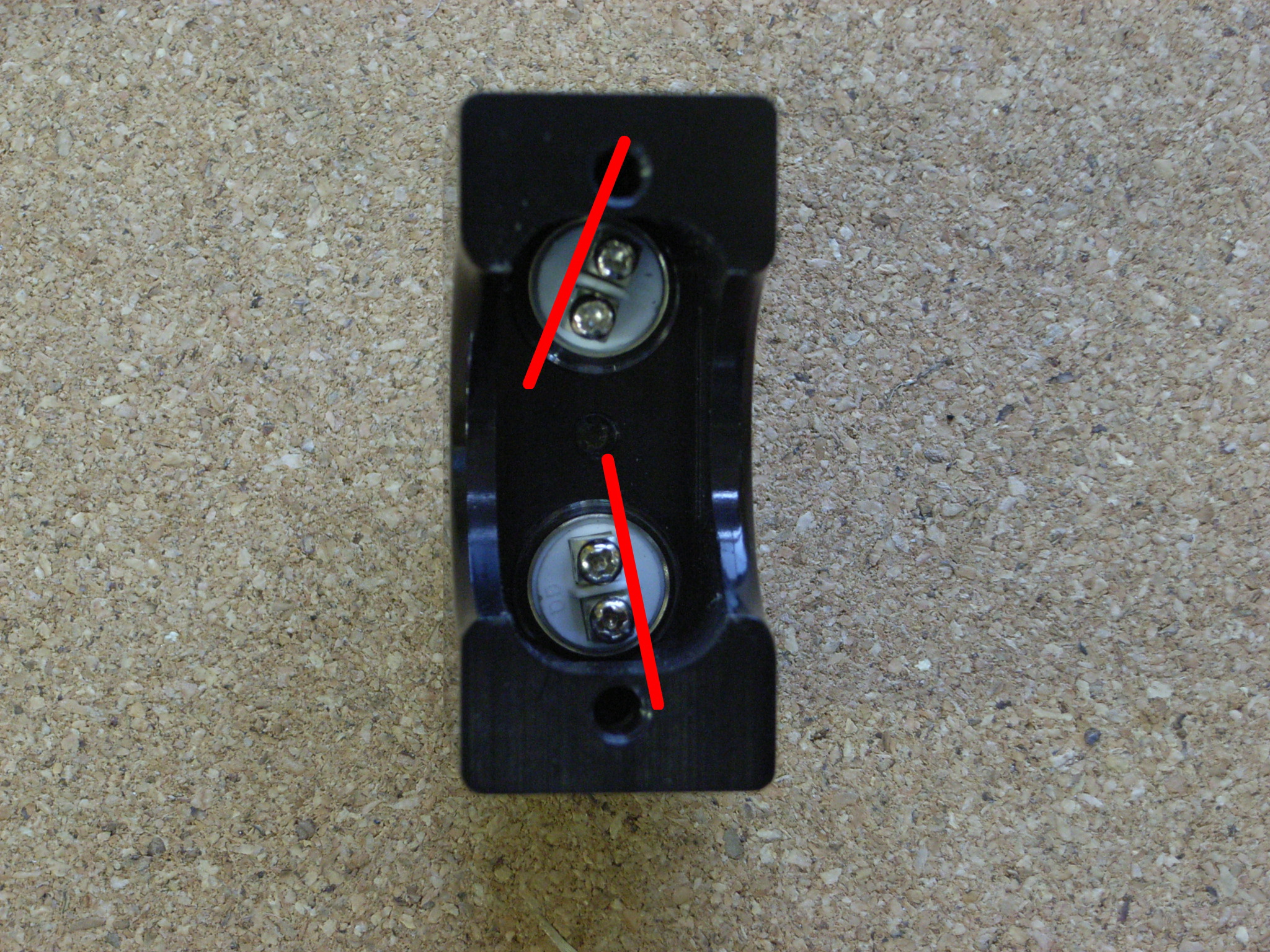 上記写真、m-スイッチの内部ですが、配線取り付け部の端子がご覧の様に斜めになっていたりします。この状態でハンドルに組みますと、端子部分がハンドルと接触し、ショートの原因となりますので、位置合わせを行って下さい。