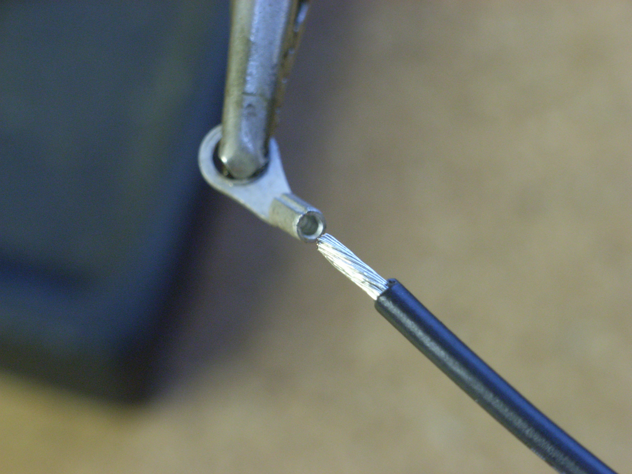 m-スイッチに付属しているアースポイント用の端子です。写真に写っている配線は18ゲージの太さですが、見事に入らず(笑)ですので、20ゲージ位の太さまでワイヤーをカットして入れました。説明書にはこの小さな端子に配線が2本入っている図なのですが、18ゲージの配線では2本は無理です。端子の外側にハンダで2本付けるとゆう策もあるかと思いますが、今回はスイッチから出た2本のアース線を1本にまとめて接続したいと思います。