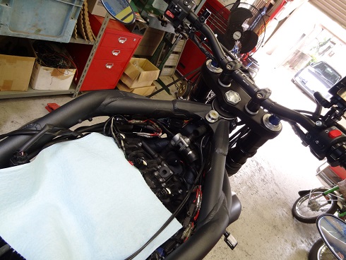 スピードトリプルはフレームからヘッドライトステーが伸びているのですが、このフレームからステーが伸びているとゆう事が曲者でして、ハンドルを切った際にヘッドライトに干渉しない様に設計されている為、ヘッドライトとメーターはかなり前に飛び出ているのです・・。