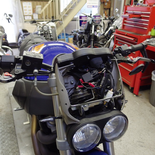 このB-Kingもヘッドライトにメーターが取り付けられている為、ヘッドライトを外す=メーターも外れる ようになっており、メーターだけ残せませんので、ブラケットの作製が必要です。