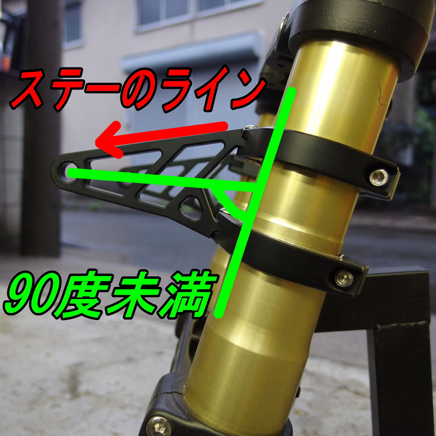このアジャスタブルヘッドライトブラケットですと、上下フォーククランプ部中心から90度未満でヘッドライトステーが延びています。つまり、地面と平行にステーが伸びているんですね。(フォークの角度にもよりますが)