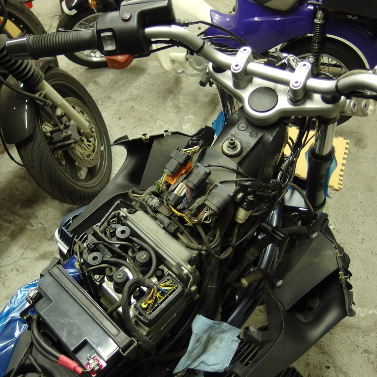 ABSユニットの前にはハンドルスイッチ、イグニッション、ヘッドライト等の前に付いている電装パーツのコネクターが纏まっています。