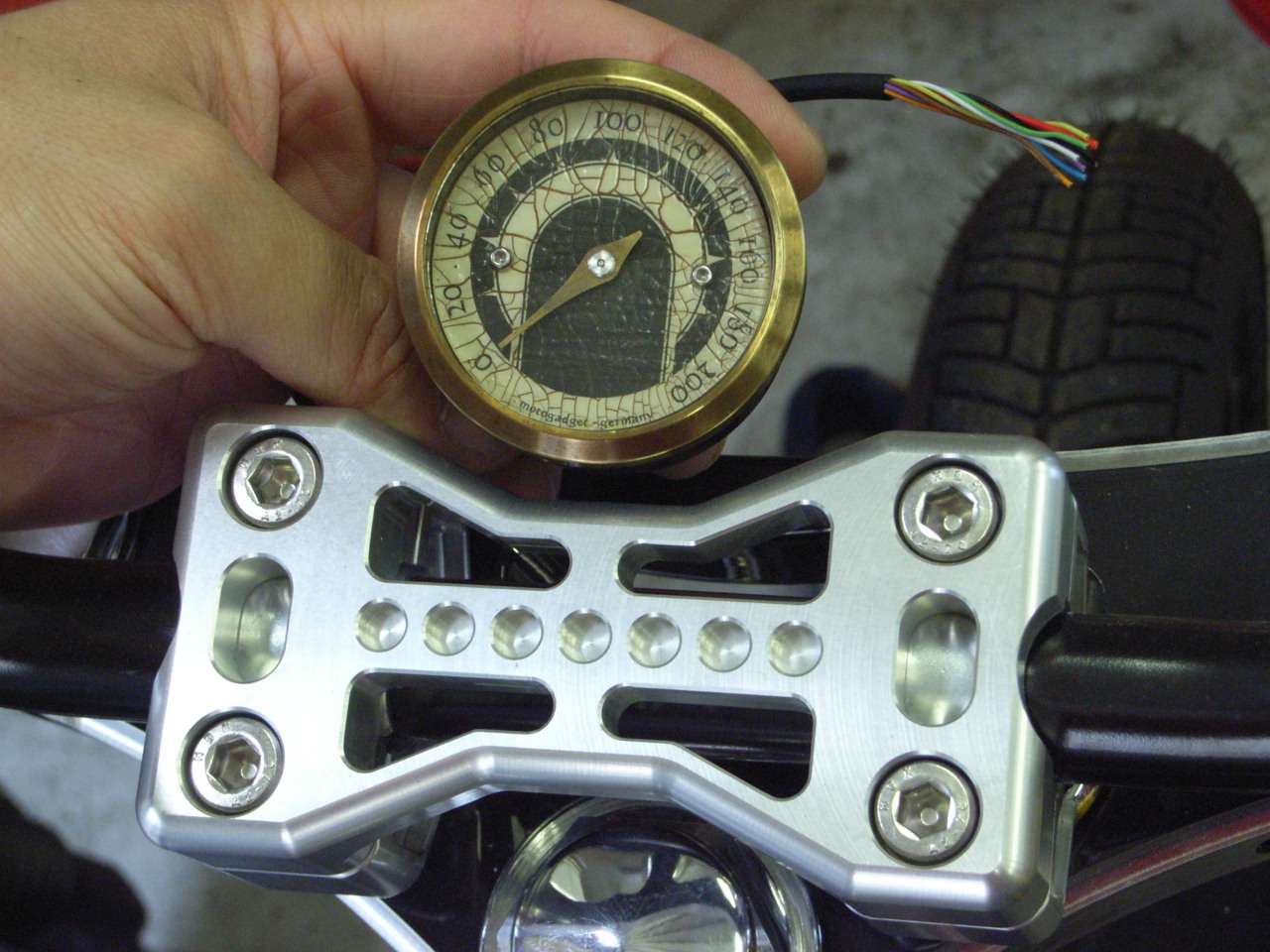 アルミビレットの高品質なメーターケース、高性能なmotogadget(モトガジェット)を付けるまでは決定しているのですが、モトガジェットの何を付けるかまでは決まっておりません…。