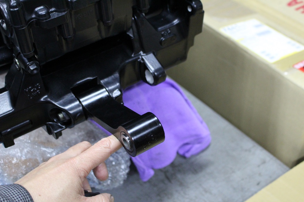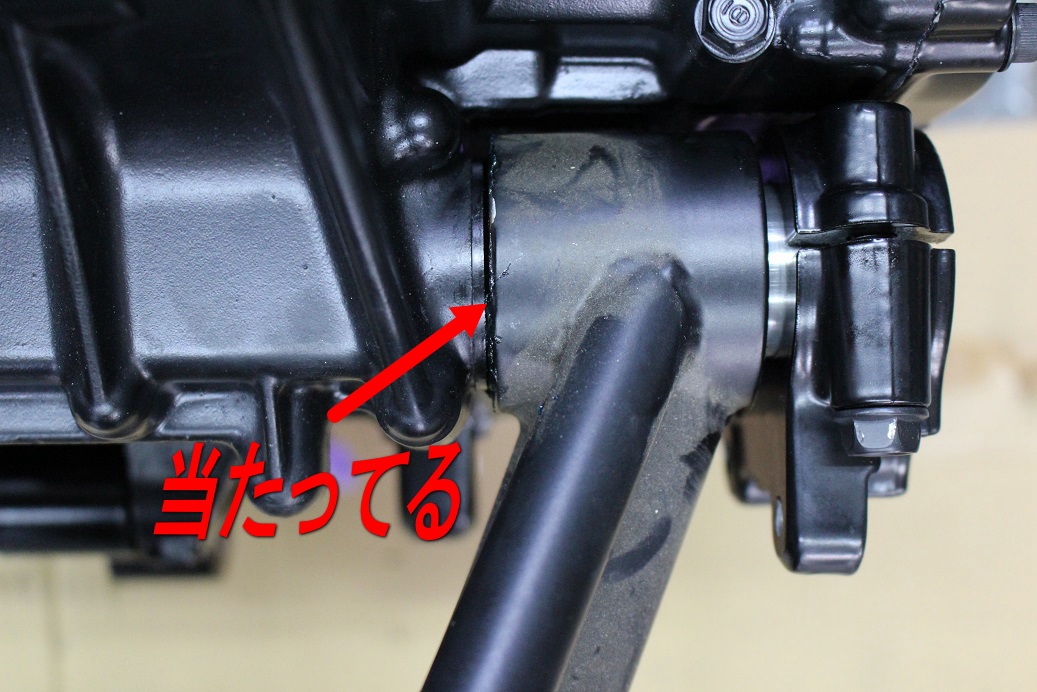 原因は規定トルクでスイングアームの取り付けシャフトを締めると、スイングアームがエンジン側に押され、干渉してしまう為。