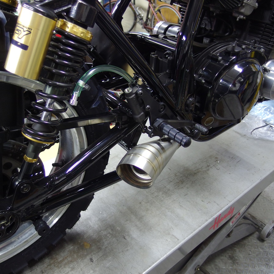 マフラーステーを取り出せるのがバックステップを固定しているネジ穴位しかなく、ちょっと不格好な気がしますが、この上にはバックステップが付くので、まあ目立たなくなるかな?とゆう感じです。