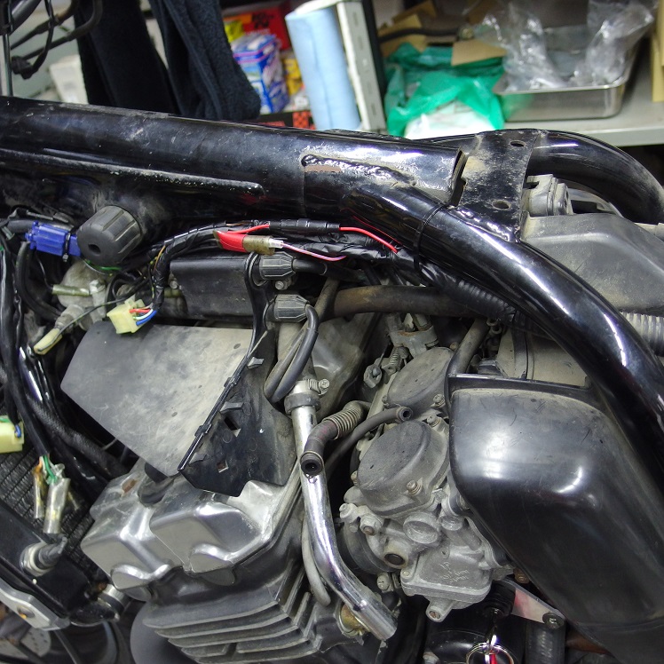 カスタムの際に余ってしまう配線は通常タンク下等に隠せる場所があれば隠して済ますのですが、このCB400SFは隠しきれておらず、無理やりタンクの下に収めた結果、パンツの上に乗っかる贅肉のような状態となり溢れていた為(笑)モトガジェットのメーターを付ける下準備も兼ねて、綺麗に取り回したいと思います!