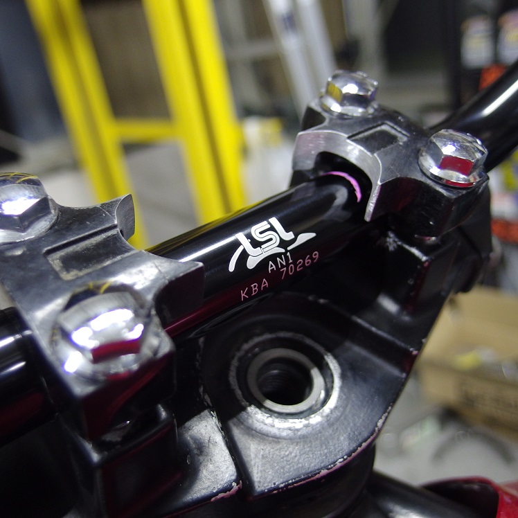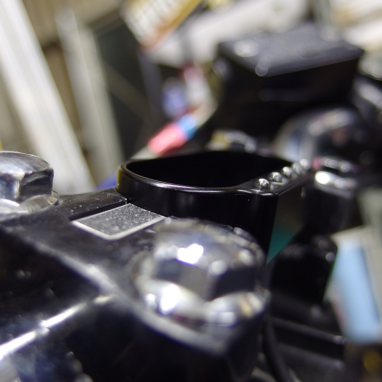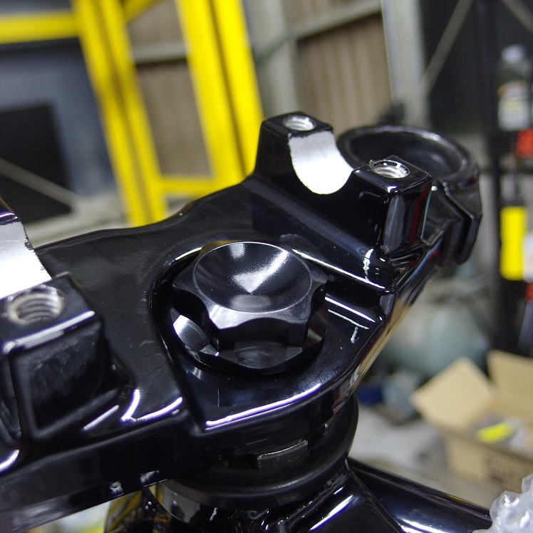 トップブリッジもパウダーコートして黒くなっているので、併せてポッシュ製のブラックアルマイトのステムボルトに変更します!