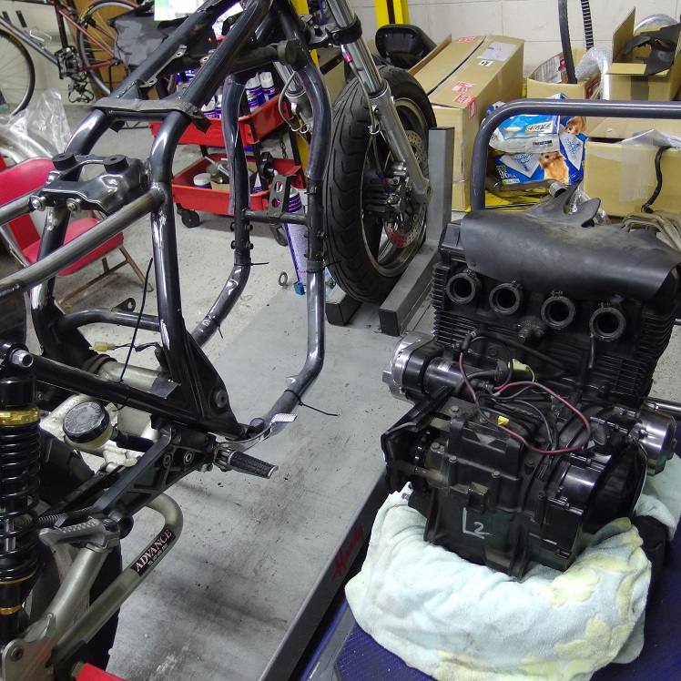知恵の輪のように取り付けられているエンジン。こんなくそ重たいエンジンを微妙に動かしながらフレームに乗せるのは至難の業なので、重たいエンジンは寝かせ、逆に軽いフレームを動かして取り付けます!