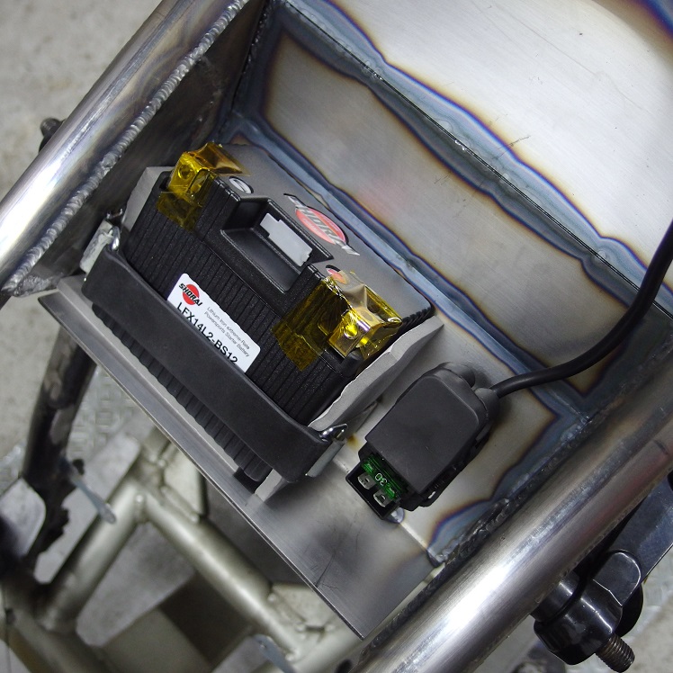 バッテリーは当店が正規代理店である、ショーライ製のリチウムバッテリーを使用。メリットは鉛バッテリーに比べて小さいサイズになる事。スペースの確保が難しいカスタム車において、重要なんです。ちなみに重量も相当軽くなりますが、レース使用でもないので重量に関してはあまりメリットは感じていませんし、こんな鉄の塊を溶接して置いて今更「重量が・・」は無いですしね(笑)