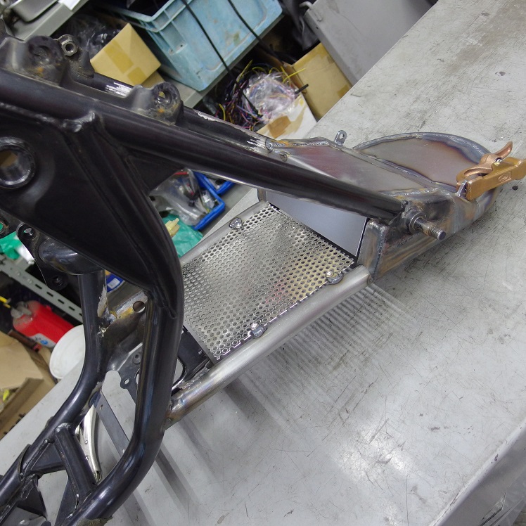 スイングアーム下側、仮部品で固定していますが、スイングアームとロッドで固定しておけば、マッドガードが動いてしまう事が防げます。