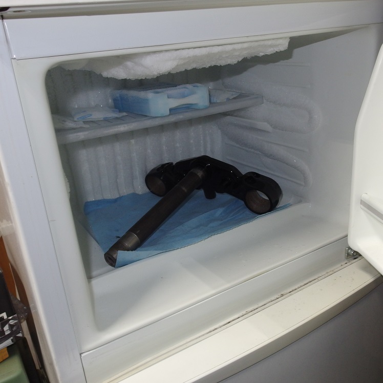 ステムもパウダーコートで黒くし、ベアリングを圧入する必要がある為、ステムごと冷凍庫で冷やしてシャフトを細くします。
