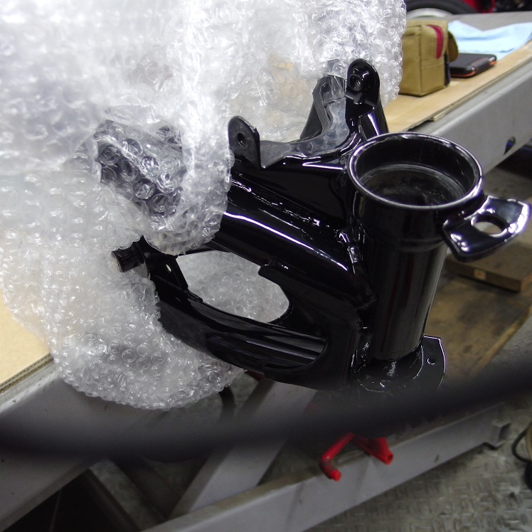 元々ガンメタだったフレームを、テッカテカのブラックにしました。