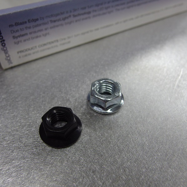 今回取り付けする場所はウインカー裏側が見える個所ですので、ウインカー固定用のナットをステンレス製から黒いステンレス製へ変更し、あまり目立たない様に配慮します。