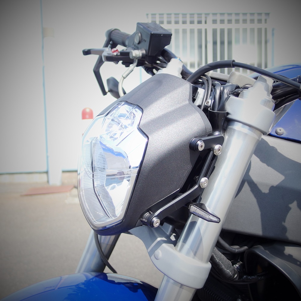 今回はアーバンヘッドライトUB1を使用。ヘッドライトブラケットはワンオフで作製し、クランプ部分は使わずに取り付けてます。