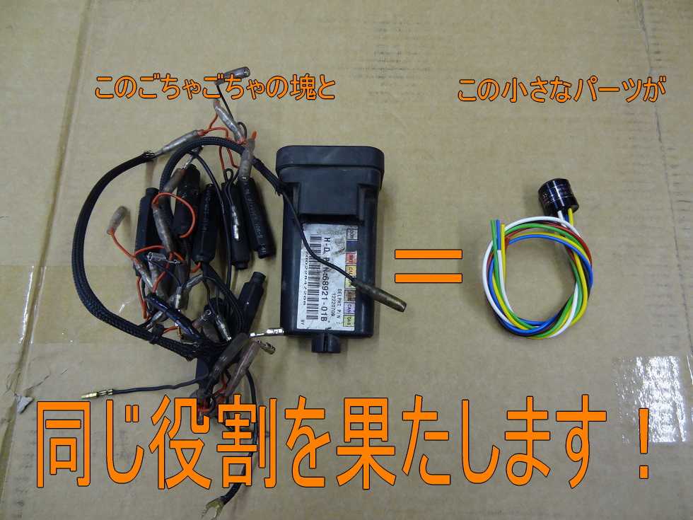 上画像のごちゃごちゃの塊はハーレーにLEDウインカーを付けていた車両から外したものですが、消費電力が少ないLEDウインカーはノーマルウインカーと付け替えただけでは正常に点滅せず、ハイフラッシャー症状(高速点滅)や点滅しない症状が起こります。これを正常な点滅させる為に抵抗を付けて、ノーマルウインカーが付いていた時と同じ消費電力を作り出すことで点滅スピードを正常にさせるんですね。
