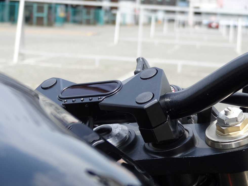 10mm厚のハンドルクランプに14mm厚のメーターを飛び出さずに取り付けるべく、ハンドルを掘り下げるとゆう斬新な手法で取り付けたモトスコープミニ。