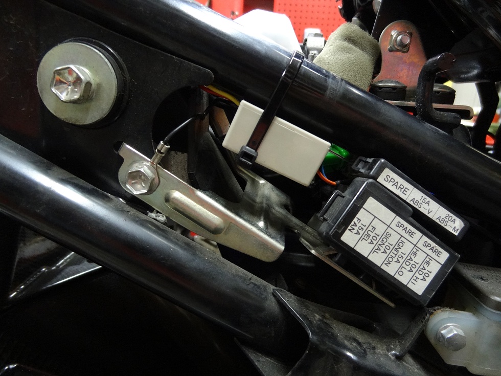 フレームにタイラップで留めても座りが良く、アースポイントも近所、そしてヒューズボックスの隣りとゆうアクセスの良さ!1等地ですよ!!(笑)