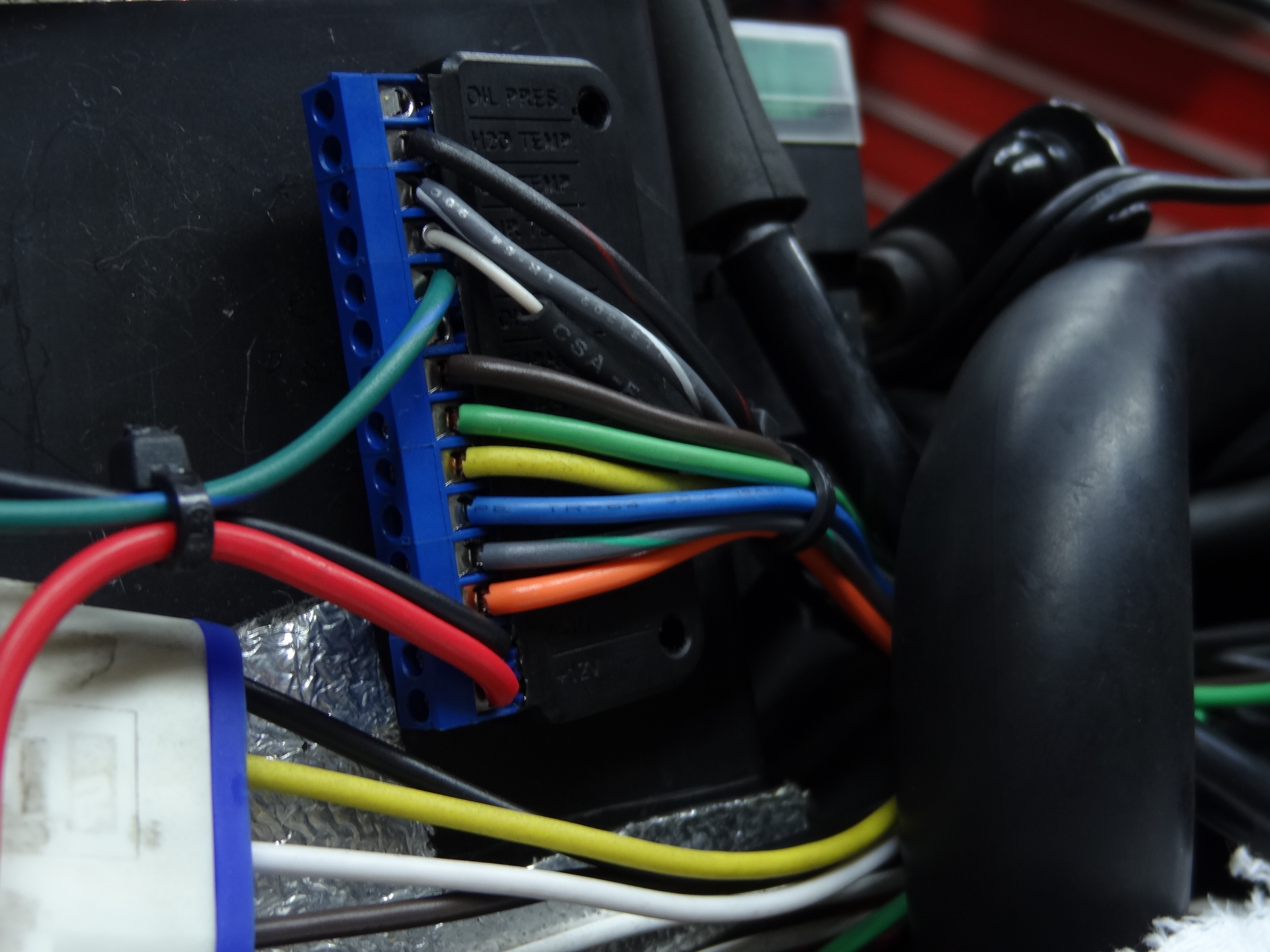 各配線が繋がれているこのブレイクアウトボックス。各インジケーター、水温、油温等の情報を先日お話したBUS接続する為のパーツです。これにより、モトスコーププロとブレイクアウトボックス間の配線は1本で接続されます!