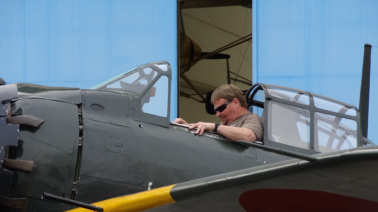 エンジン始動見学会が終り、足早に会場を後にする人もいる中、原田要 氏が零戦に搭乗!!