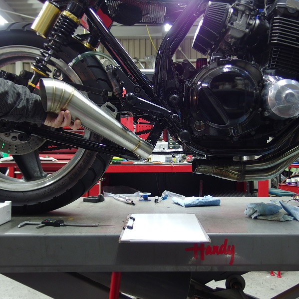 エキパイとサイレンサーの接合部は溶接で永久固定でもいいのだけど、脱着できる方が何かと便利かなと思うので、分割式にします。