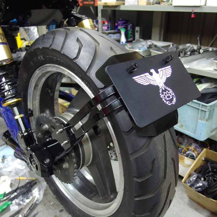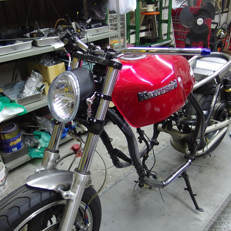 つなみにヘッドライトはオーバルヘッドライト08、ヘッドライトスブラケットはLSLヘッドライトブラケットのクランプを使用し、ステー部分はZRX400に似合うよう作ってます!