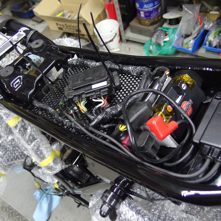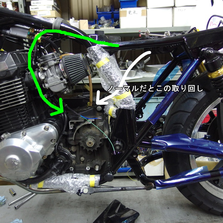 エンジンへ繋がる配線はノーマルだとシート下(白い矢印)のラインで引かれていますが、緑矢印の遠回りなラインで引き直し。