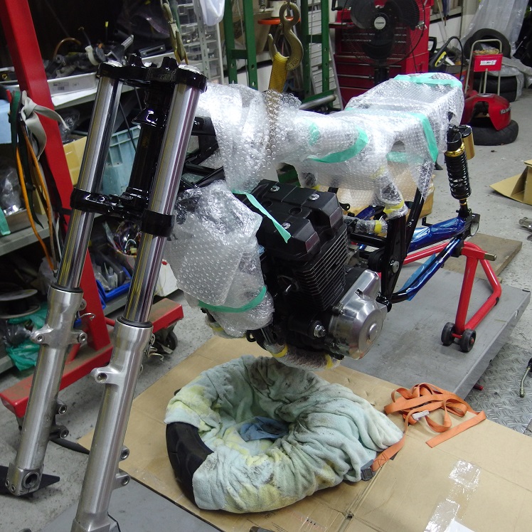 知恵の輪のように取り付けられているエンジン。こんなくそ重たいエンジンを微妙に動かしながらフレームに乗せるのは至難の業なので、重たいエンジンは寝かせ、逆に軽いフレームを動かして取り付けます!