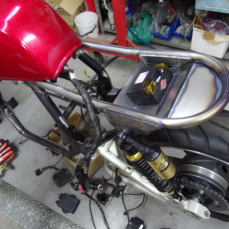 バッテリーは当店が正規代理店である、ショーライ製のリチウムバッテリーを使用。メリットは鉛バッテリーに比べて小さいサイズになる事。スペースの確保が難しいカスタム車において、重要なんです。ちなみに重量も相当軽くなりますが、レース使用でもないので重量に関してはあまりメリットは感じていませんし、こんな鉄の塊を溶接して置いて今更「重量が・・」は無いですしね(笑)