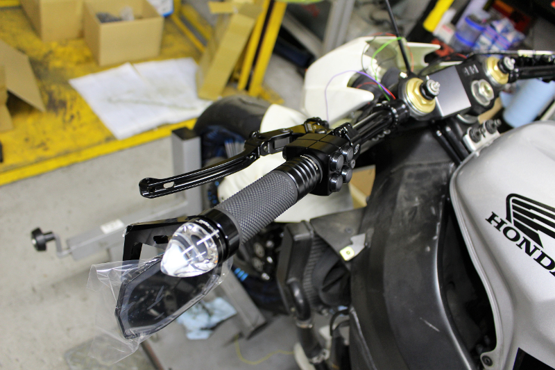 バーエンドウインカーの配線はもちろんの事、ブレーキスイッチの配線もハンドル内へ通してます!